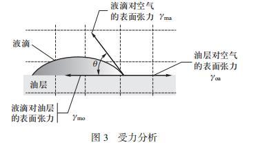 液滴爆炸現象的第二階段邊緣處的液滴產生液滴噴發現象,在該過程中液滴中部較厚的部分不斷向邊緣輸送液體,因此會穩定持續一段時間。為解釋這一階段,先從表面張力入手,因為接觸角的不同,水對油的表面張力大于乙醇對油的表面張力,則混合液體對油層的界面張力介于水和乙醇之間。混合液滴中乙醇的比例越大,混合液體對油層的界面張力越小,受到向內的張力減小,這樣整體向外的張力增大,這是產生向外推動的驅動力的重要原因。可見界面張力直接決定了液滴在界面上的擴散和運動。