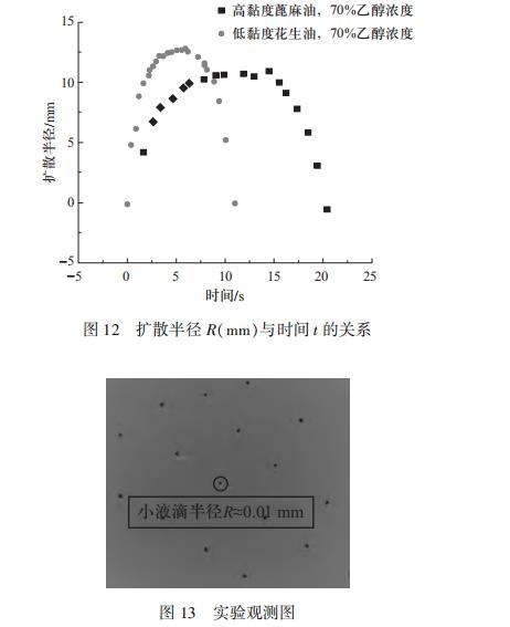 故本文將選擇不同黏度梯度的疏水性物質進行實驗。采用蓖麻油和花生油進行試驗,蓖麻油的黏度(1452.91 mm2/s)遠大于花生油(108.34 mm2/s),當乙醇濃度為70%時,在蓖麻油上最終液滴的半徑接近0.01 mm,遠小于對應花生油的測量值0.0743 mm.分析實驗數據得到結論:微觀上黏度增大會導致最終形成的液滴減小,宏觀上黏度越大,液滴爆炸總時間越長,最大擴散半徑越小。