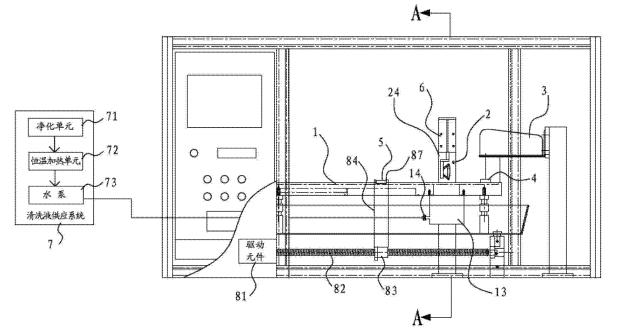 [0019]在一些實施方式中,清洗槽的底部凹設有容納孔,容納孔能夠容納板材樣品插入到容納孔中,容納孔的底部設有排液閥,清洗液供應系統供應的清洗液通過管道傳送到容納孔中,清洗液從容納孔當中漫出并流滿整個清洗槽。其有益效果是,設置容納孔后,可以方便樣品完全沒入到清洗液當中,這樣清洗槽就只需要在容納孔位置設置的較深,其它位置設置得較淺即可。否則的話如果需要讓樣品完全沒入清洗液中,就需要將清洗槽整體設置成很深。設置排液閥后,可以很方便排干清洗槽中的清洗液。