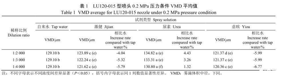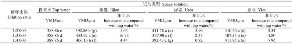 注:數字后不同字母表示同1行不同溶液間差異顯著(<0.05),括號內字母表示同1列數值顯著性差異(<0.05)。VMD:霧滴體積中徑。下同。