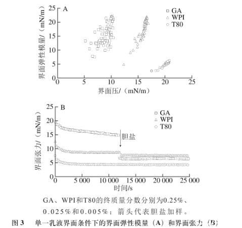 由圖3A可知,GA和WPI界面的彈性模量值基本一致,比T80界面的彈性模量值高很多。說明此質(zhì)量分數(shù)條件下GA和WPI形成的界面相對T80有更好的界面黏彈性。這是由于大分子GA和WPI具有較強的空間位阻,在乳滴界面可形成較厚的吸附層,乳滴空間穩(wěn)定性較好,可在一定程度上抵御外力造成的變形。T80屬于小分子表面活性劑,在界面吸附致密整齊,但乳滴的空間穩(wěn)定性較差,易發(fā)生變形和聚集。圖3B表明,在加入膽鹽后,GA界面的界面張力降低值ΔT為8.42 mN/m,T80界面的界面張力基本不變,WPI界面的界面張力降低值ΔT為1.09 mN/m,由此證明T80的抗膽鹽取代能力最優(yōu),其次為WPI和GA。3種乳化劑所呈現(xiàn)的界面特性與3種乳液的消化動力學(xué)規(guī)律相吻合。采用界面流變技術(shù)可有效評價乳化劑的界面特性,腸液組分對乳滴界面特性造成的影響以膽鹽取代最為顯著。因此,通過評價膽鹽在界面的取代能力,可在一定程度上判斷乳液的脂肪消化動力學(xué)規(guī)律。