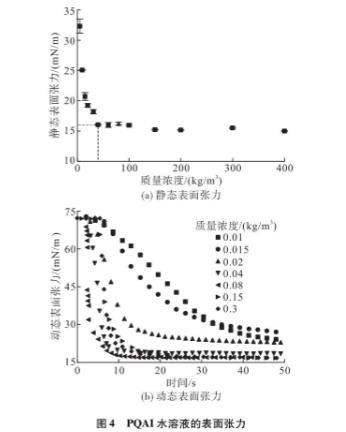 因此,本文采用芬蘭Kibron公司的表面張力儀在20一22℃下研究了溶液的界面性質(zhì),如靜態(tài)和動態(tài)表面張力。不同PQAI溶液的靜態(tài)表面張力的變化如圖4(a)所示。可以看出,在去離子水中加人少量表面活性劑,溶液的表面張力急劇下降。然而,在質(zhì)量濃度>0.04kg/m2時(shí),下降趨勢開始緩慢。這意味著PQAI水溶液的pcMc~0.04kg/m2,此時(shí)表面活性劑水溶液靜態(tài)表面張力為16.07mN/m。