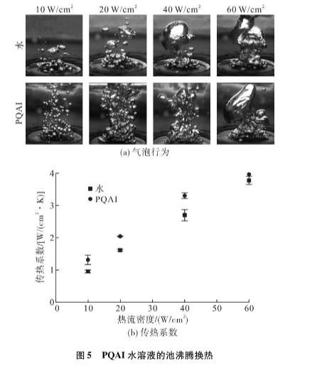 本文研究了PQAI溶液的池核沸騰換熱特性,試驗(yàn)臺參數(shù)參考文獻(xiàn)。圖5顯示了PQAI溶液在臨界膠束濃度下的沸騰傳熱性能。與水相比,由于PQAI水溶液中表面張力的降低,沸騰時(shí)產(chǎn)生的氣泡數(shù)量顯著增加,氣泡半徑減小。此外,在低熱流密度下,可以明顯觀察到在氣泡脫離時(shí)氣泡聚結(jié)的趨勢減小,并且氣泡的形狀更接近球形。表面活性劑分子由極性親水頭和疏水性長尾組成。
