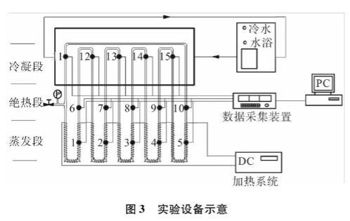 脈動熱管由外徑4 mm、內(nèi)徑2 mm,經(jīng)氧乙炔正火處理后銅毛細(xì)管彎曲而成。圖3示出了脈動熱管實(shí)驗(yàn)設(shè)備的示意圖。用誤差傳播法分析了實(shí)驗(yàn)裝置的不確定性。電壓電流精度為1%。本文中最小電壓和電流分別為17.9V和1.7A。此外,熱電偶的不確定度為0.1℃。在蒸發(fā)器和冷凝器的最小溫差為45℃時(shí),熱阻的最大相對不確定度為4.47%。