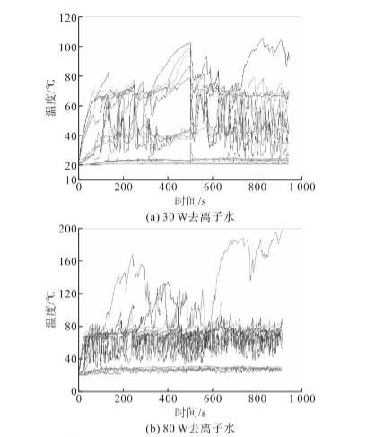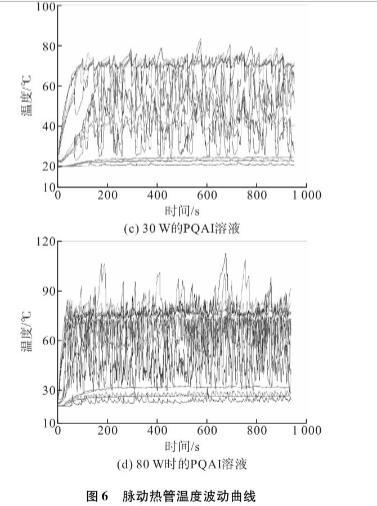 研究了充灌量對脈動熱管運行穩(wěn)定性和熱性能的影響,結果表明50%為最佳充灌率。因此,本文采用了50%的充灌率。圖6顯示了不同加熱功率下采用去離子水或PQAI水溶液脈動熱管的溫度波動曲線。