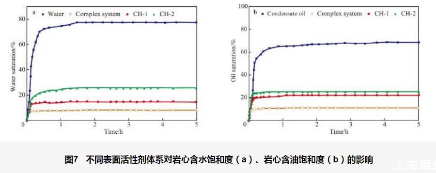 與單一表面活性劑體系相比,經復合表面活性劑體系處理后巖心含油飽和度最低,說明復合表面活性劑體系有效減少了巖心的液侵量,進而起到了預防液侵的效果。由毛細管壓力公式可知,毛細管力的大小與水/凝析油的表面張力、潤濕性和巖石中多孔介質的孔喉半徑有關。在復合表面活性劑體系對巖心表面潤濕改性前,毛細管力是巖心自發滲吸的主要動力,復合表面活性劑體系降低水/凝析油的表面張力,削弱了毛細管力,從而減小了巖心的液侵量。當復合表面活性劑體系在巖心表面充分吸附,形成一層帶有潤滑和隔離作用的疏水疏油膜時,巖心表面由親水親油變為疏水疏油,毛細管力由巖心自發滲吸的主要動力轉變為阻力,從而起到預防液侵的作用,進而減小巖心液侵量。