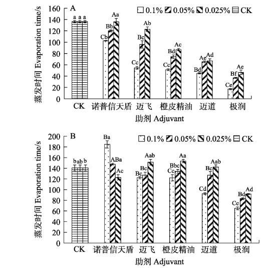 葉片背面,助劑質量分數為0.025%時,與CK相比,極潤助劑能使藥液蒸發時間縮短34.84%,其次是諾普信天盾縮短12.56%,而邁道和邁飛與CK間無顯著差異,而橙皮精油的蒸發時間增加9.24%;助劑質量分數為0.05%時,極潤助劑使藥液蒸發時間縮短41.00%,其次是邁道和邁飛均縮短9.72%,而橙皮精油和諾普信天盾與CK無顯著差異;助劑質量分數為0.1%時,極潤助劑使藥液蒸發時間縮短53.79%,其次是邁道縮短34.36%,橙皮精油和邁飛則分別縮短13.27%和13.04%,而諾普信天盾的蒸發時間增加31.28%(圖5B)。