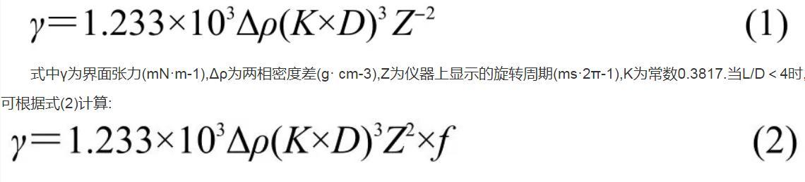式中γ為界面張力(mN·m-1),Δρ為兩相密度差(g·cm-3),Z為儀器上顯示的旋轉周期(ms·2π-1),K為常數0.3817.當L/D<4時,可根據式(2)計算: