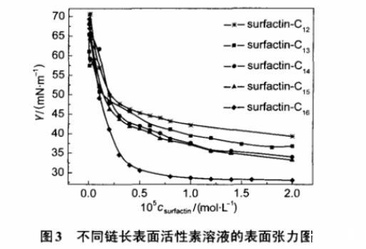 采用表面張力、界面張力、熒光、動態光散射(DLS)和冷凍刻蝕電鏡(FF-TEM)等方法,研究了由Bacillus subtilis HSO121所產生的一組表面活性素的膠束化行為。通過對表面活性素溶液表面張力、表面活性素對水/正己烷界面張力的影響、表面活性素膠束微極性以及膠束粒徑和形態的研究,發現隨著表面活性素脂肪鏈長度的增加,其表界面活性增強,溶液中趨向于形成更大的聚集體。