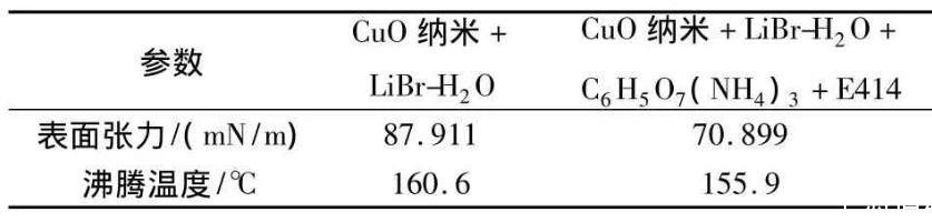 為了便于觀察3種表面活性劑對納米LiBr——H2O表面張力和沸騰溫度的影響,實驗測量了不含此3種表面活性劑的納米LiBr——H2O的表面張力和沸騰溫度,見表1。