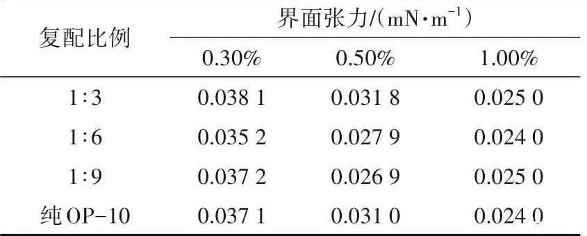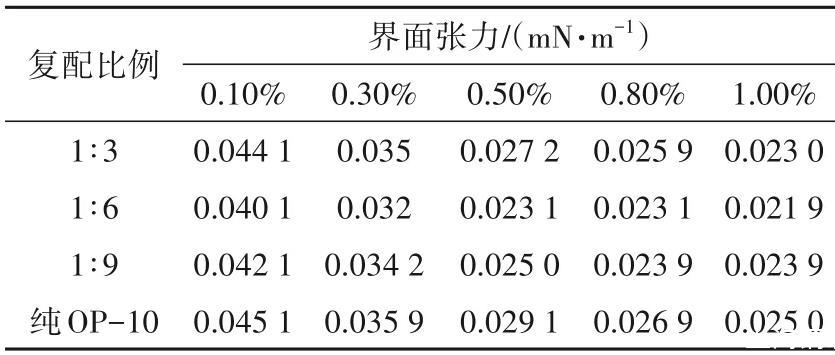將HPAM配制成質(zhì)量分?jǐn)?shù)為0.10%的水溶液,與不同濃度的OP-10按不同比例復(fù)配,并測(cè)定不同復(fù)配體系的界面活性,結(jié)果見表3。