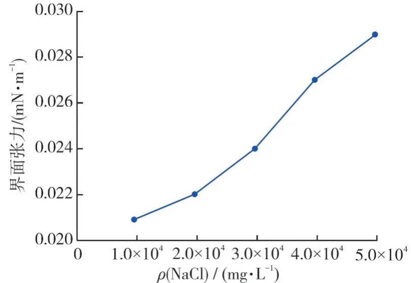 4)隨著礦化度的增加,最佳二元復(fù)配體系的界面張力最大只變化了0.008 mN/m左右,證明HPAM和OP-10復(fù)配體系保留了非離子表面活性劑的特點(diǎn),抗鹽性能較好。
