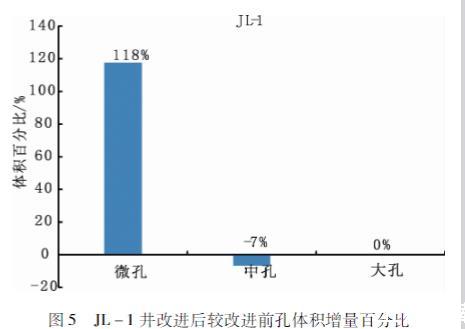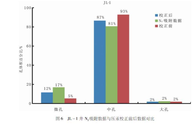 用參數(shù)校正后的方程處理數(shù)據(jù)發(fā)現(xiàn)樣品微孔孔體積占比增加,較原始方程處理得到的結(jié)果增加了118%;而中孔孔體積占比減小,較原始方程處理得到的結(jié)果減小了7%;大孔孔體積占比不變。用改進后的Washburn方程對松遼盆地青山口組JL-1、JL-3、SL1-9、SL1-13井的泥頁巖樣品的數(shù)據(jù)處理得出:該地區(qū)主要以微孔、中孔為主,發(fā)育有小部分大孔。統(tǒng)計壓汞實驗數(shù)據(jù)發(fā)現(xiàn)微孔占比平均12%左右,中孔占比平均為86%,大孔占比平均為2%。依據(jù)實驗數(shù)據(jù)評估,松遼盆地青山口組地區(qū)油氣主要儲集在中孔里面。因此,提高微小孔(<50 nm)烴源巖儲集層的勘探開發(fā)有十分重要的意義。