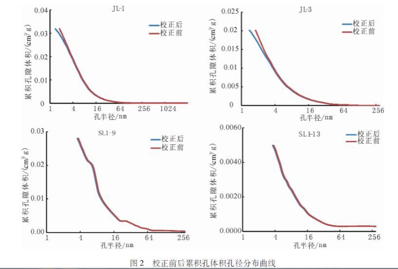 應用參數(shù)校正前后的Washburn方程對松遼盆地青山口組JL-1、JL-3、SL1-9、SL1-13井的泥頁巖樣品壓汞數(shù)據(jù)處理得到累積孔體積的孔半徑分布曲線,分析發(fā)現(xiàn):參數(shù)校正后的方程對于微小孔的影響較大,在孔半徑小于4 nm時,校正前后的兩條曲線出現(xiàn)明顯的不重合(圖2)。