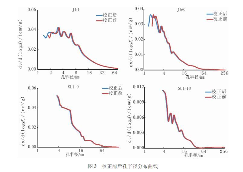 同樣應用參數(shù)校正前后的Washburn方程對松遼盆地青山口組JL-1、JL-3、SL1-9、SL1-13井的泥頁巖樣品的數(shù)據(jù)處理、對比發(fā)現(xiàn)——參數(shù)校正后的方程對于半徑為4 nm以下的孔有較大的影響,對于半徑為4 nm以上的孔基本上沒有影響(圖3)。
