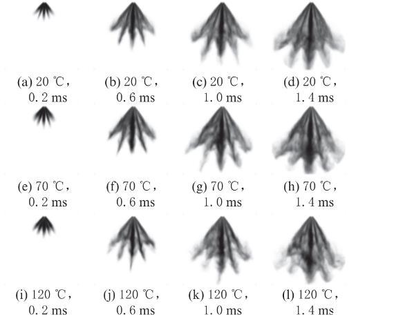圖4不同環境溫度和噴霧開始后時刻下甲醇的噴霧形態