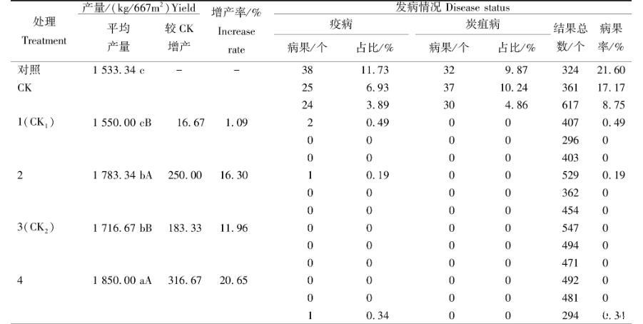 從表3看出,各處理與對(duì)照的產(chǎn)量、發(fā)病情況均存在差異。