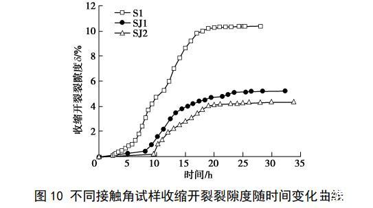 圖10為不同接觸角試樣收縮開裂裂隙度隨時間的變化關(guān)系曲線,接觸角變化后,土體收縮開裂的3個階段并不會發(fā)生改變,但土顆粒的接觸角越大,試樣經(jīng)歷第一階段,即收縮開裂醞釀階段的時間越長,相同的脫濕時間,接觸角越大的土樣所對應(yīng)的收縮開裂裂隙度越小。試驗結(jié)束后,SJ1樣和SJ2樣的最終收縮開裂裂隙度分別為5.2%和4.3%,是所有試樣中收縮開裂裂隙度最小的兩個,其中接觸角最大的SJ2樣的試樣最終收縮開裂裂隙度又比SJ1樣小。由此可見,增大土顆粒與孔隙水間的接觸角可以很好的抑制土體的收縮開裂。