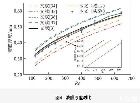 通過合理的假設,建立了一個三維數學模型來預測傾斜壁面上的液膜流動特性。圖4是在入口溫度為20℃和壁面傾斜角度為15°時,不同Re的液膜厚度的對比曲線。本文將實驗測得的液膜厚度與文獻中報道的用于預測水平圓管和傾斜平板上液膜厚度的經驗公式進行了比較,同時還將Nusselt提出的經典液膜厚度公式和本文建立的數學模型計算結果進行了對比分析。隨著雷諾數的增大,無論是實驗數據、理論公式還是模型計算,所得的液膜厚度均逐漸增加,且實驗結果的平均值與Nusselt理論具有良好的一致性。圖4中的放大圖進一步顯示,模型計算結果與Nusselt理論所得結果非常接近,這主要是因為模型計算中采用了Nusselt理論作為迭代初值。然而,模型計算值始終略小于Nusselt理論值,這是由于在式(17)中考慮了蒸發質量通量Js。在絕熱條件下,模型計算包含了一項蒸發質量通量的影響,從而導致計算的液膜厚度略低于Nusselt理論預測值。這一差異表明,在實際條件下,蒸發效應對液膜厚度的影響不可忽略,模型的引入使計算更加貼近實際。