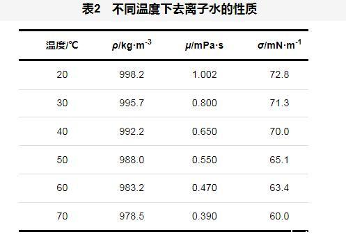 能夠在壁面上完全鋪展的液膜不僅僅與壁面的結構和潤濕性有關,還與液體本身的物性有著密切關系。較高的黏度會導致液膜在流動過程中變得更加穩定且不容易破裂,使得液膜的分布相對均勻;表面張力會改變壁面上液膜的潤濕性,從而影響液膜在壁面上的鋪展能力。因此,深入探討不同物性對液膜分布的影響,具有重要的理論意義和實際應用價值。在實驗中工作液體包括去離子水、乙二醇、丙二醇。工作液體的性質,如表1所示。同時溫度的變化將直接影響液體的黏度和表面張力,隨著溫度的升高液體分子的動能也隨之增強,分子間的相互作用減弱,黏度和表面張力都將減小,進而影響液膜的形成和鋪展,不同溫度下去離子水的性質,如表2所示。