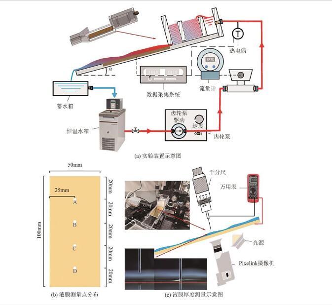 本實驗的實驗裝置,如圖3(a)所示。該裝置主要由液體回路、布液器和實驗段三大部分組成。液體回路用于提供不同的流動條件,以確保布液器能夠穩定形成液膜。在這個回路中,液體從恒溫水箱(Julabo-Vivo RT2)中流出,恒溫水箱提供一個穩定的入口溫度,由齒輪泵(Cole-parmer)控制液體流量大小,液體再流入流量計(Micro motion 2700,精度為±0.05%),流量計監測管道內液體的質量流量,在布液器的入口端放置一個T型熱電偶(精度為±0.5℃)來測量入口溫度的變化,最后使用數據采集器(Keithely 2700)采集流量計的質量流量、熱電偶的溫度和加熱片的功率。本實驗對入口溫度要求較高,所以采用一些保溫措施,在不銹鋼管和布液器腔室周圍包裹一層保溫棉,減少熱量損失。