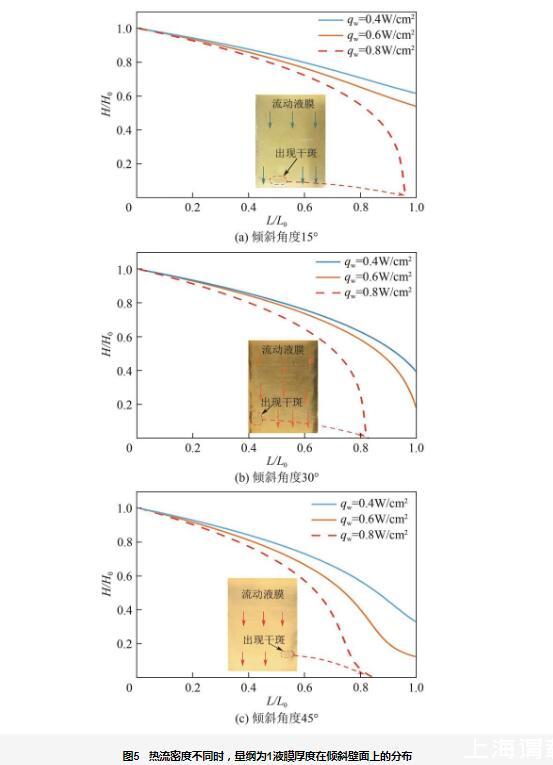 圖5所示的數學模型中,壁面傾斜角度分別為15°、30°和45°,噴淋密度為0.016kg/(m·s)、0.03kg/(m·s)和0.04kg/(m·s),入口溫度為70℃。通過施加不同的熱流密度加熱壁面,模型計算得出了量綱為1液膜厚度在傾斜壁面上的分布情況。結果顯示,當熱流密度qw=0.8W/cm2時,不同傾斜角度下的壁面上量綱為1液膜厚度均逐漸減小,最終降至零,出現了燒干現象。同時,模型計算結果與實驗結果相符,干斑位置均出現在壁面底部,這一現象的產生不僅是由于蒸發的作用,還與熱毛細效應密切相關。在加熱過程中,熱毛細效應促進了液膜表面張力的變化,使得液膜的穩定性減弱,導致液膜局部破裂。隨著蒸發效應的增強,液膜厚度逐漸減小,特別是在液膜的薄弱區域,蒸發速率提高,導致液膜厚度進一步減小,最終在底部區域發生破裂。因此,干斑通常出現在壁面底部,這進一步驗證了實驗結果與數學模型計算之間的良好一致性,并表明所建立的數學模型能夠有效預測液膜在傾斜加熱壁面上的流動行為和燒干現象。