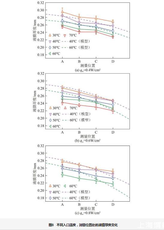 在加熱條件下,由于液體入口溫度不斷提升以及流經(jīng)正在加熱壁面上,液膜將會產(chǎn)生水蒸氣冷凝在探針頭部,從而影響通過攝像機(jī)觀測液膜氣液界面的判斷。本實驗中,在探針底部粘貼一塊直徑為9mm的陶瓷加熱片,在加熱傾斜壁面的同時也加熱探針,避免水蒸氣凝結(jié)在探針頭部影響對液膜厚度的測量。為了觀測到傾斜加熱壁面上液膜出現(xiàn)干斑現(xiàn)象,減小去離子水的噴淋密度,但仍然確保液膜能夠完全鋪展在壁面上。圖8展示了在壁面傾斜角度為15°、噴淋密度為0.016kg/(m·s)的條件下,不同熱流密度和入口溫度對各測量位置液膜厚度變化的影響,并與模型計算值進(jìn)行了對比。當(dāng)入口溫度為70℃、熱流密度qw=0.8W/cm2時,液膜厚度變化消失,由于加熱壁面出現(xiàn)了干斑。