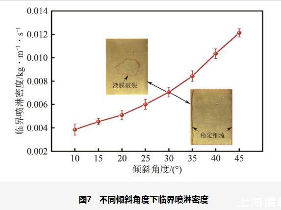 從圖7中可以看出,在較低的傾斜角度(如10°~25°)下,液膜受重力在壁面平行方向分量的影響較小,主要依靠噴淋液體的動能和潤濕性來維持覆蓋。此時,液膜較厚,表面張力對毛細(xì)波動的抑制作用較強(qiáng),能夠有效抵御擾動,流動較為穩(wěn)定,因此臨界噴淋密度較低。然而,在較高的傾斜角度(如30°~45°)下,重力在流動方向的分量顯著增強(qiáng),液膜受到更大的重力驅(qū)動力作用,易發(fā)生滑移和局部脫離壁面現(xiàn)象。同時,傾斜角度增大會使液膜變薄,液膜內(nèi)剪切力增大,進(jìn)一步放大表面張力波動對擾動的響應(yīng),從而導(dǎo)致液膜對擾動的敏感性提高,流動不穩(wěn)定性顯著增強(qiáng)。此外,局部區(qū)域的液膜破裂會導(dǎo)致液膜整體失穩(wěn),最終在兩側(cè)形成穩(wěn)定細(xì)流。因此,為了維持液膜的完整性和連續(xù)性,需要提高噴淋密度以抵消重力和表面張力波動的破壞作用,從而導(dǎo)致臨界噴淋密度在高傾斜角度下顯著升高。