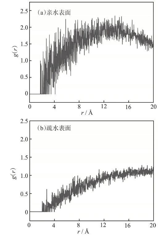為了進(jìn)一步揭示鼠李糖脂分子與親水、疏水表面之間的相互作用以及成鍵模式,計(jì)算了鼠李糖脂分子與不同潤(rùn)濕性表面的徑向分布函數(shù)[g(r)]。計(jì)算以動(dòng)力學(xué)模擬1000 ps后的穩(wěn)定結(jié)構(gòu)為基礎(chǔ),結(jié)果如圖5所示。對(duì)于親水表面,鼠李糖脂分子距離1.3~2.0?的范圍內(nèi)出現(xiàn)了明顯的峰,表明分子與該表面在此范圍內(nèi)有新鍵生成,作用力較強(qiáng)。這主要是由于親水表面的羥基基團(tuán)與鼠李糖脂親水環(huán)之間存在氫鍵作用。2.0?之后的峰主要由范德華力和靜電作用形成,從而產(chǎn)生了較高的吸附結(jié)合能(E=29.7 eV)。對(duì)于疏水表面,g(r)在2.0?之內(nèi)均沒(méi)有明顯的峰,說(shuō)明疏水表面與鼠李糖脂分子之間并沒(méi)有氫鍵生成,只有范德華力和靜電相互作用等弱作用力。這是由于疏水表面的十八烷基長(zhǎng)鏈分布松散,與鼠李糖脂分子的相互作用較弱,在界面處疏水基團(tuán)與鼠李糖脂分子間形成薄層空隙,導(dǎo)致結(jié)合能較低(E=12.2 eV)。