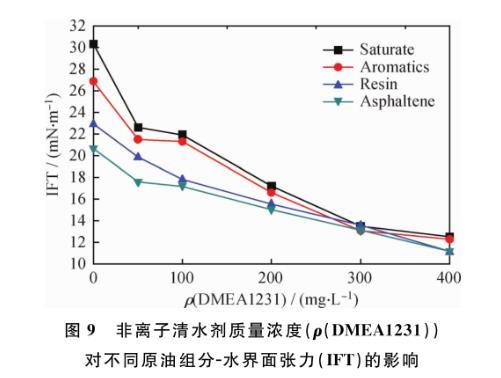 圖9非離子清水劑質(zhì)量濃度(ρ(DMEA1231))對(duì)不同原油組分-水界面張力(IFT)的影響