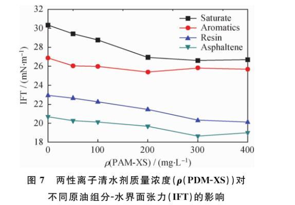 圖7兩性離子清水劑質(zhì)量濃度(ρ(PDM-XS))對(duì)不同原油組分-水界面張力(IFT)的影響