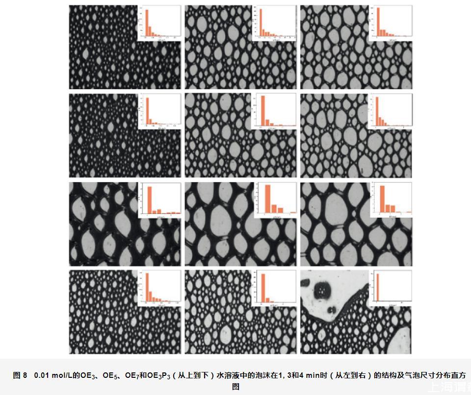 圖8 0.01 mol/L的OE3、OE5、OE7和OE3P3(從上到下)水溶液中的泡沫在1,3和4 min時(從左到右)的結構及氣泡尺寸分布直方圖
