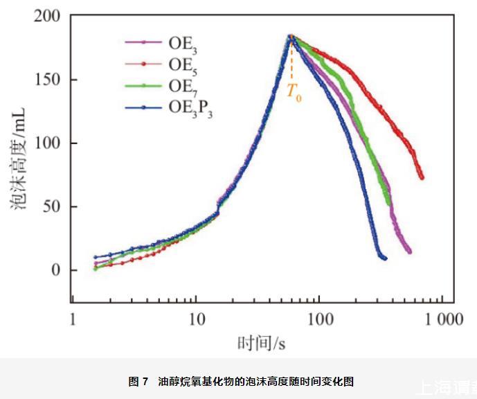 起泡性和穩(wěn)泡性是表面活性劑泡沫性的兩個非常重要的特征。圖7是0.01 mol/L油醇烷氧基化物水溶液在氣體流量為150 L/min時測量的泡沫衰減曲線。圖中的T0為停止通氣時間,可用此時的泡沫高度表示表面活性劑的起泡性,此后泡沫開始排液并發(fā)生衰減。從圖中可以看出,4種油醇烷氧基化物在60 s時的泡沫高度基本都為183 mm,說明4種烷氧基化物的起泡性基本一致。在停止通氣后,油醇烷氧基化物的泡沫高度迅速降低,并沒有經過一個泡沫高度維持不變的時間段,說明此時泡沫不僅開始排液并且發(fā)生了坍塌,油醇烷氧基化物的泡沫不穩(wěn)定。從圖中還可以看出,OEn中泡沫衰減速度為:OE3>OE7>OE5,在255 s后,OE3和OE7的泡沫衰減速度幾乎一致。而OE3P3的泡沫衰減速度最快,這可能是因為PO的支化結構使得液膜的強度較差所致。