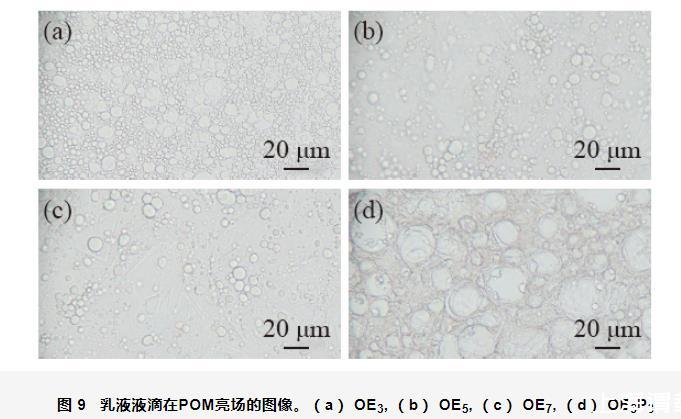 對制備的乳液在POM暗場進行了觀察,液晶乳液的結構紋理圖如圖10所示。由圖10可知,隨著OEn中EO加合數的增加,乳液液晶結構的紋理由“馬耳他十字”花紋向纖維狀轉變;當在OE3中引入PO基團后,乳液液晶結構的紋理依然呈“馬耳他十字”花紋狀。但對比圖10(a)和(d)發(fā)現,以OE3P3作為乳化劑形成的液晶結構尺寸要大于以OE3為乳化劑形成的液晶。“馬耳他十字”花紋和纖維狀液晶結構紋理說明4種乳液中都存在著層狀液晶。