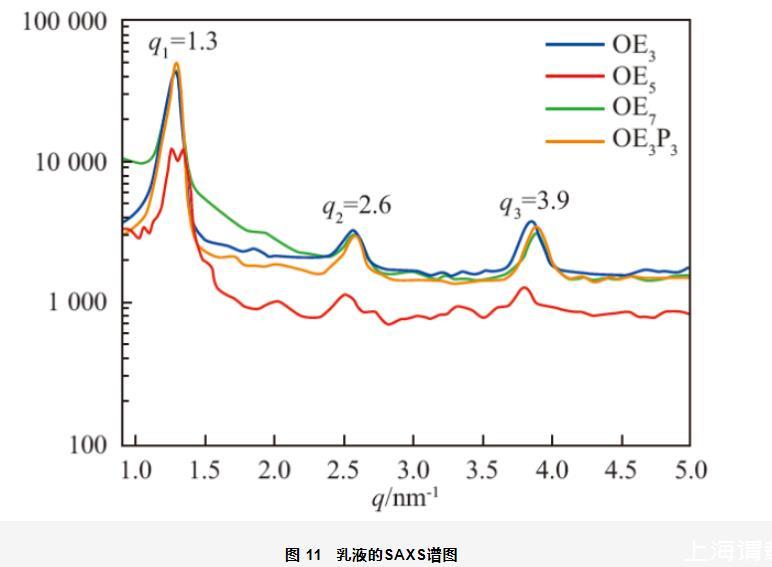對乳液進行了SAXS測試,結果如圖11所示。由圖可知,4種乳液的SAXS譜圖中都出現了3組衍射峰,且q1∶q2∶q3滿足1∶2∶3,進一步證明了乳液的層狀液晶結構,q2處明顯的衍射峰表明液晶結構的長程有序,使乳液不容易發(fā)生結塊或絮凝等,起到穩(wěn)定乳液的作用。另外,以OE5為乳化劑制備的乳液的SAXS譜圖中出現了很多毛刺,說明樣品的有序性較差。