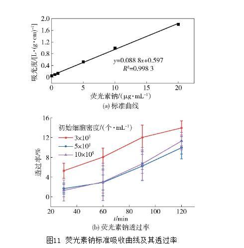標(biāo)記物跨膜通量的測(cè)定也可以反映單層細(xì)胞膜的完整性,熒光素鈉標(biāo)準(zhǔn)吸收曲線及其在不同時(shí)間段的透過(guò)率見(jiàn)圖11。由圖11(a)的熒光素鈉的標(biāo)準(zhǔn)曲線方程中,代入BL側(cè)的吸光度,可計(jì)算出BL側(cè)的熒光素鈉質(zhì)量,根據(jù)式(4),即可得出不同時(shí)間段的熒光素鈉透過(guò)率[圖11(b)]。由圖11(b)可知,孵育2 h后,3個(gè)不同初始密度的細(xì)胞模型均對(duì)熒光素鈉具有一定的透過(guò)性。初始細(xì)胞密度為3×105個(gè)/mL的細(xì)胞模型對(duì)熒光素鈉的透過(guò)率相對(duì)較高,達(dá)到13.96%;初始AP側(cè)加入熒光素鈉的密度為20μg/mL,最終3種模型的熒光素鈉透過(guò)量均小于0.011 6μg/min,說(shuō)明3種細(xì)胞模型單層膜的致密性能良好。