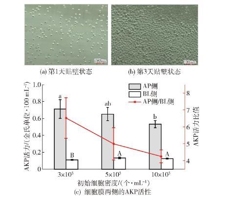 Caco-2細(xì)胞培養(yǎng)狀態(tài)及培養(yǎng)21 d后的堿性磷酸酶活性見(jiàn)圖10。由圖10(a)、(b)可以發(fā)現(xiàn),培養(yǎng)3 d過(guò)程中,單層Caco-2細(xì)胞生長(zhǎng)穩(wěn)定并均勻分布在Transwell上,貼壁情況良好。堿性磷酸酶AKP是小腸刷狀緣細(xì)胞的標(biāo)志酶,其濃度代表了單層Caco-2細(xì)胞的極化和功能。觀察圖10(c)可知,培養(yǎng)21 d后,不同接種細(xì)胞密度在AP側(cè)的酶活性均高于BL側(cè)的酶活性,屬正常的細(xì)胞極化結(jié)果。初始密度為3×105個(gè)/mL的細(xì)胞AP側(cè)的AKP活性高于其他兩組,其BL側(cè)的AKP活性低于其他兩組,證明該組細(xì)胞分化情況較好。隨著細(xì)胞密度的增大,AP側(cè)與BP側(cè)活力的比值呈下降趨勢(shì),說(shuō)明初始細(xì)胞密度過(guò)大不利于細(xì)胞的分化。實(shí)驗(yàn)結(jié)果表明,3種模型細(xì)胞均生長(zhǎng)良好。