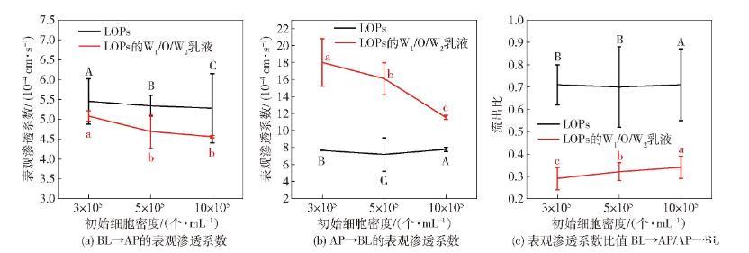 圖(a)和圖(b)中,不同大寫(xiě)、小寫(xiě)字母分別表示LOPs、LOPs雙重乳液的組間表觀滲透系數(shù)存在顯著差異(P<0.05),圖(c)中,不同大寫(xiě)、小寫(xiě)字母分別表示LOPs、LOPs雙重乳液的組間流出比存在顯著差異(P<0.05)。
