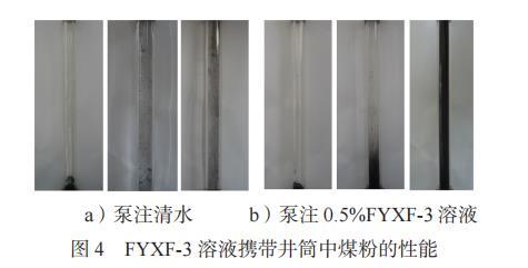 由圖4a)看出,裝有清水的有機玻璃管底部的煤粉沒有被懸浮,且泵注后,排出液中幾乎沒有攜帶出煤粉。由圖4b)看出,裝有0.5%FYXF-3溶液的有機玻璃管底部的煤粉被懸浮,且泵注后,排出液為黑色渾濁液體,攜帶出煤粉質量為0.25g。可以看出,濃度為0.5%的FYXF-3溶液對煤粉的懸浮性能較好,可以將井筒堆積的韓城現場煤粉懸浮,并隨著返排液返排至地面。
