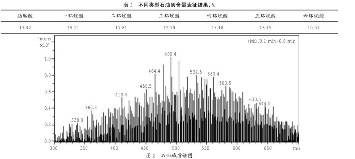 (1)萃出石油酸組分含量為3.88%,相對分子質主要分布在400~900,碳數對應C27~C62,結構以環烷酸為主;