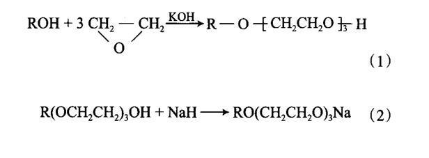 EO數為3的C14脂肪醇聚氧乙烯醚(3)磺酸鹽(C14EO3S)、C16脂肪醇聚氧乙烯醚(3)磺酸鹽(C16EO3S)、C18脂肪醇聚氧乙烯醚(3)磺酸鹽(C18EO3S)按文獻[1]報道的方法合成,產物經兩相滴定法測定磺酸鹽含量,純度均達到95%以上。合成反應見式(1)~(3)。