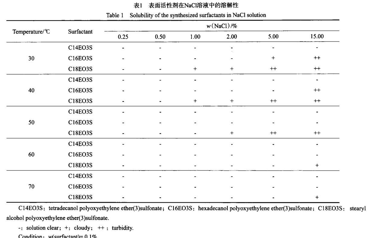 系列脂肪醇聚氧乙烯醚磺酸鹽表面活性劑制備、溶解性、表面張力及界面張力測定(一)