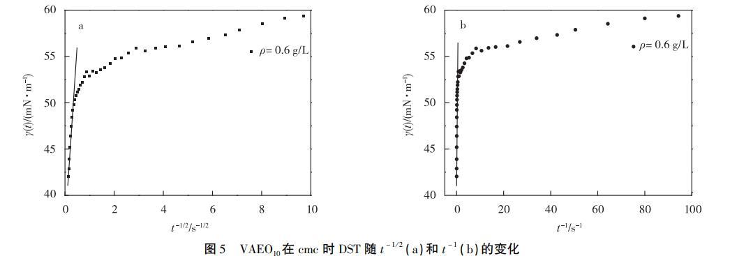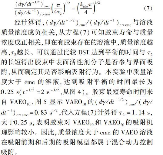 經(jīng)計(jì)算得,(dγ/dt-1/2)cmc/(dγ/dt-1)c>cmc與溶液質(zhì)量濃度成負(fù)相關(guān),從方程(7)可知膠束壽命與質(zhì)量濃度成正相關(guān),即在有膠束存在的溶液中,質(zhì)量濃度越高,τ2越長。可以通過比較DST達(dá)到平衡的時間與τ2的長短得出膠束中表面活性劑分子是否參與界面吸附,從而確定其是否影響吸附行為。本實(shí)驗(yàn)中質(zhì)量濃度大于cmc的溶液,達(dá)到吸附平衡的時間最長為0.25s(t-1/2=2s-1/2,見圖4)。膠束最短壽命時間來自VAEO10,圖5顯示VAEO10的(dγ/dt-1/2)cmc/(dγ/dt-1)c≈cmc=0.83s1/2,代入方程(7)計(jì)算得τ2=1.14s,大于0.25s,表明膠束對VAEO10和VAEO20的吸附機(jī)理影響較小。因此,質(zhì)量濃度大于cmc的VAEO溶液在吸附前期和后期的吸附模型都屬于混合動力控制吸附。