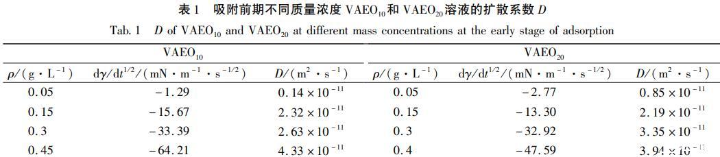 在初始吸附階段,表面層VAEO分子很少,可以用方程(2)來表述表面張力與時間的關(guān)系,對非離子表面活性劑,式中n=1.以y(t)對t/2作圖,結(jié)果見圖3.短時間內(nèi)γ(t)與t1/2成直線關(guān)系,直線截距對應(yīng)溶劑的表面張力,擴(kuò)散系數(shù)D可由直線斜率求出,結(jié)果見表1.
