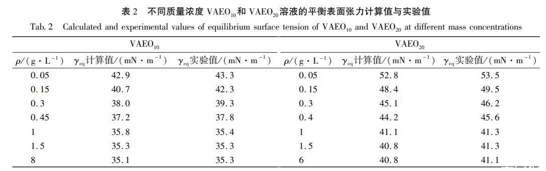 從以上對VAEO10和VAEO20在氣/液界面的吸附行為的研究可知,當(dāng)質(zhì)量濃度小于cmc時,二者在吸附前期均表現(xiàn)為擴(kuò)散控制吸附,擴(kuò)散系數(shù)D的數(shù)量級為10-11m2/s,在吸附后期均為混合動力控制吸附,表觀擴(kuò)散系數(shù)Da的數(shù)量級為10-12m2/s.膠束存在時,τ2較長,大于到達(dá)γeq所需時間teq,膠束形成不影響表面張力隨時間的變化趨勢。據(jù)文獻(xiàn)報(bào)道,壬基酚聚氧乙烯醚(NPEO9)濃度小于cmc時的擴(kuò)散系數(shù)為3.9×10-10m2/s(滴體積法),平衡表面張力為30.6mN/m,可推測NPEO10的擴(kuò)散系數(shù)在3.9×10-10m2/s附近,大于本研究中VAEO10的擴(kuò)散系數(shù)。VAEO的疏水部分分子結(jié)構(gòu)比NPEO的大,前者較后者多一個縮醛環(huán)和一個甲氧基,這兩個基團(tuán)一方面造成VAEO的空間體積較大,另一方面,縮醛環(huán)中的——O-與水分子可能形成氫鍵,均增加了VAEO擴(kuò)散時的阻力,因而降低了擴(kuò)散速率。