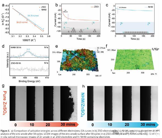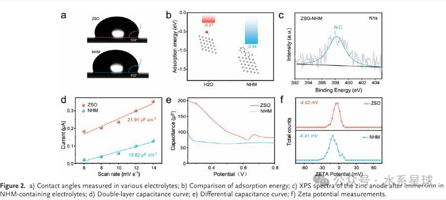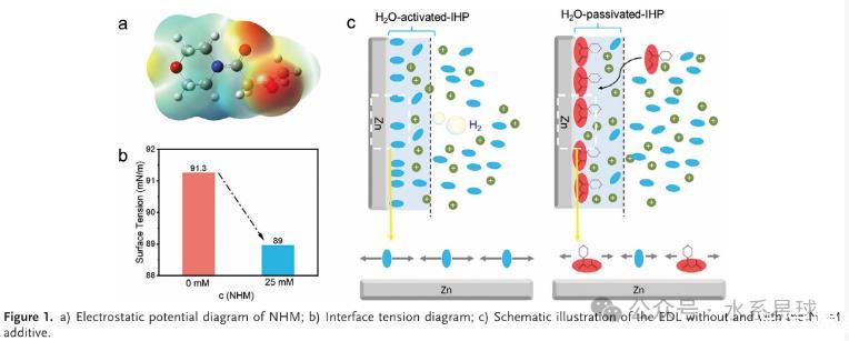 本研究探索了一種新型有機NHM添加劑,旨在增強陽極界面穩(wěn)定性并改善鍍覆/剝離行為。通過降低界面張力,NHM添加劑重塑了電雙層(EDL),有效限制了鋅陽極與H?O之間的接觸,從而抑制了寄生反應。
