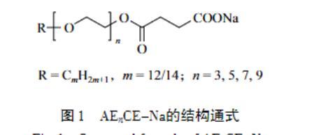 表面活性劑是一類應用廣泛的有機化合物,極少的用量就能顯著提高溶液的性能,因此,表面活性劑的研究具有重要的現(xiàn)實和理論意義。其中,陰離子和非離子型表面活性劑的用量最多且應用最為廣泛,它們具有優(yōu)異的去污性、水溶性、耐熱性、耐鹽性及制備成本低和環(huán)境友好等優(yōu)點。然而,傳統(tǒng)的表面活性劑分子通常只包含一個親水頭基和一個疏水尾鏈,很難同時具有陰離子和非離子表面活性劑的特性。值得一提的是,脂肪醇醚琥珀酸酯鹽(AEnCE-Na,n=3,5,7,9)是一種新型的表面活性劑,結(jié)構(gòu)通式如圖1所示。結(jié)構(gòu)決定性質(zhì),因此,可以推斷AEnCE-Na具有許多優(yōu)異的性能:1)一個分子中同時存在兩個親水基團(EO鏈和陰離子頭基)和一個疏水基團(烷基碳鏈),使其具有優(yōu)異的表面活性、乳化性和發(fā)泡性;2)分子中的酯基在水解后可形成具有優(yōu)異生物降解性的非離子表面活性劑和鹽,因此,該類表面活性劑安全且環(huán)保,符合當代“綠色化”的發(fā)展理念;3)直鏈表面活性劑比支鏈表面活性劑具有更好的自降解能力。然而,目前對于脂肪醇醚琥珀酸酯鹽表面活性劑的研究甚少。