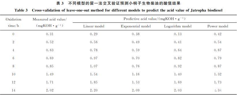 留一法交叉驗證是建立預測模型的一種常用方法,從N個觀測數據中選擇一個觀測數據作為驗證數據,然后使用剩下的(N-1)個觀測數據擬合一個模型,并用驗證數據來驗證模型的精度,如此重復N次。考慮到數據量以及相關性,筆者利用Excel建立了線性、指數、對數、乘冪4種預測模型,對小桐子生物柴油酸值的預測結果見表3。