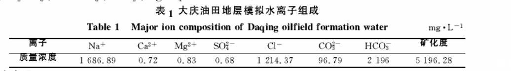 實驗用油樣為大慶原油與煤油按體積比9∶1混合而成(簡稱模擬油)。其中,大慶原油酸值為0.05 mg KOH/g;煤油由北京燕山石油化工有限公司提供,實驗前用活化后的硅膠反復吸附處理,處理后與二次蒸餾水界面張力大于48mN·m—1.實驗用Na2CO3弱堿溶液(簡稱Na2CO3溶液)由Na2CO3與蒸餾水配置,質量分數為0.53%.實驗用水樣為大慶油田地層模擬水(簡稱模擬水),離子組成見表1.實驗所用試劑NaCl、Na2CO3、NaHCO3、CaCl2、MgSO4均為分析純。
