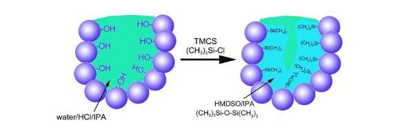 如圖6所示,采用三甲基氯硅烷(trimethyl chlorosilane,簡稱TMCS)對氧化硅凝膠孔壁表面進(jìn)行疏水化處理,可實現(xiàn)常壓干燥制備氣凝膠。其中TMCS和異丙醇(isopropanol,簡稱IPA)分別作為疏水化試劑和溶劑。TMCS與靠近顆粒表面的孔反應(yīng),使孔壁表面的Si-OH轉(zhuǎn)化成硅甲基,有利于阻止水的吸附,形成孔表面疏水區(qū)域。同時,TMCS水解縮合生成六甲基二硅氧烷(hexamethyldisiloxane,簡稱HMDSO),且不與水混溶,隨著反應(yīng)的持續(xù)進(jìn)行,水相逐漸從孔中排出,最終形成超疏水氣凝膠。